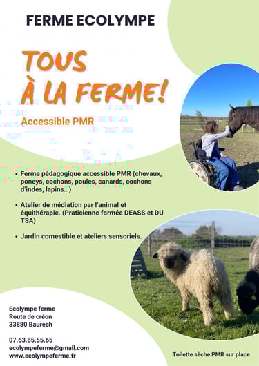 "J'ai visité en juin c'est une petite ferme très sympathique, avec plein d'animaux différents, des cochons hyper mignons, qui ont été sauvés grâce à cette ferme, des chevaux qui sont utilisés pour de l'équithérapie, des chèvres sociables. On voit en visitant que Sara est passionnée et prend vraiment soin d'eux, je recommande la visite aux amis des animaux."